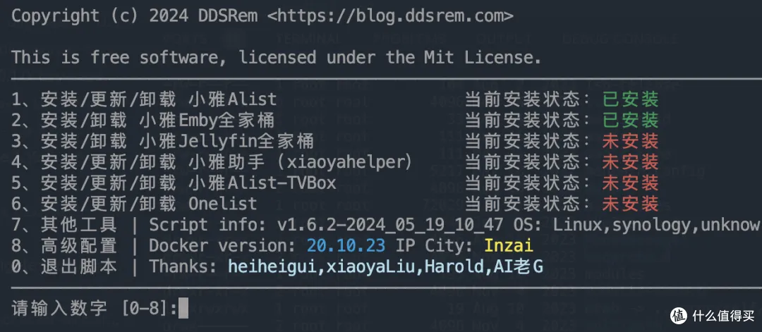 执行脚本后的效果。没有安装过小雅AList和Emby全家桶则会显示未安装